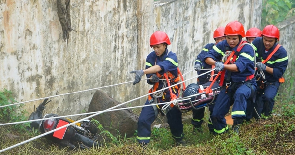 Giữa mưa gió trên sườn dốc bán đảo Sơn Trà, Công an TP.Đà Nẵng diễn tập ứng cứu nạn nhân rơi xuống vực sâu trong vụ tai nạn liên hoàn giả định.