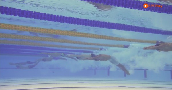 Phạm Thanh Bảo giành HCV nội dung 200 m bơi ếch. Anh ăn mừng bằng cách giơ chữ T động viên bạn gái Mỹ Tiên.